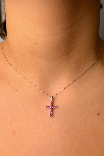 COLLANA CROCE IN ORO BIANCO 18K E RUBINI