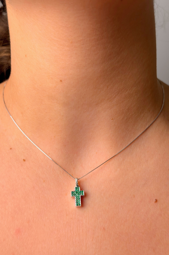 COLLANA CROCE IN ORO BIANCO 18K E DIAMANTI CON SMERALDI