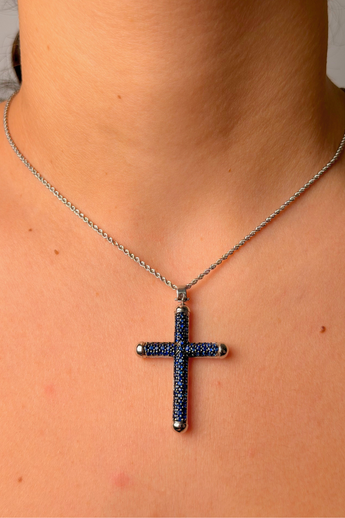 COLLANA CROCE IN ORO BIANCO 18K CON DIAMANTI E ZAFFIRI