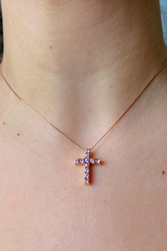 COLLANA CROCE IN ORO ROSA 18K CON ZAFFIRI ROSA