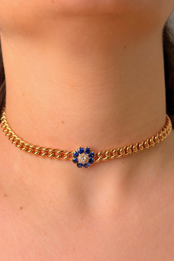 COLLANA GROUMETTE FIORE IN ORO GIALLO 18KT CON DIAMANTI E ZAFFIRI